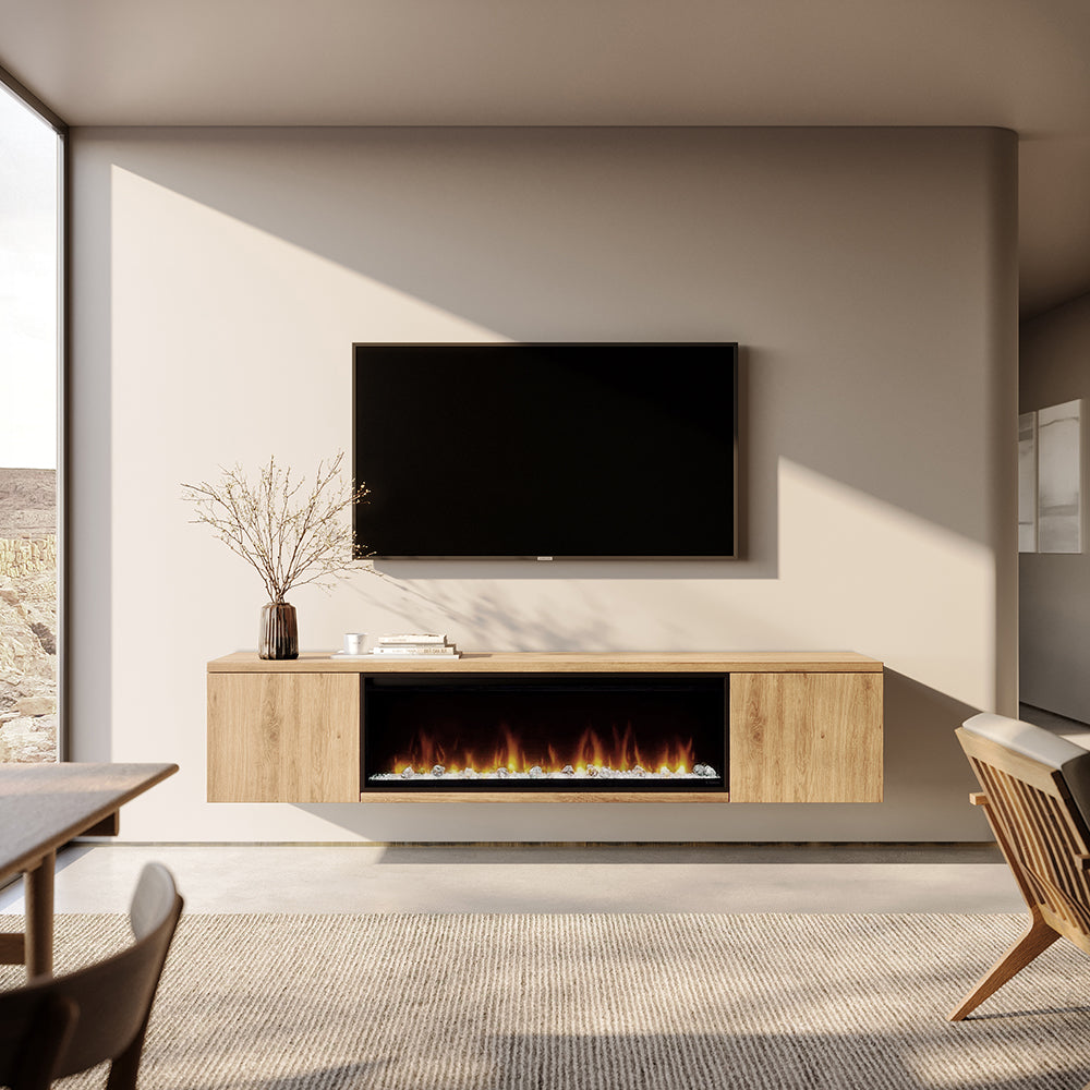 Ons Japandi TV-meubel combineert tijdloos minimalisme met warmte en functionaliteit. Het strakke, serene ontwerp is voorzien van een elegante elektrische haard die sfeer toevoegt aan je woonkamer.