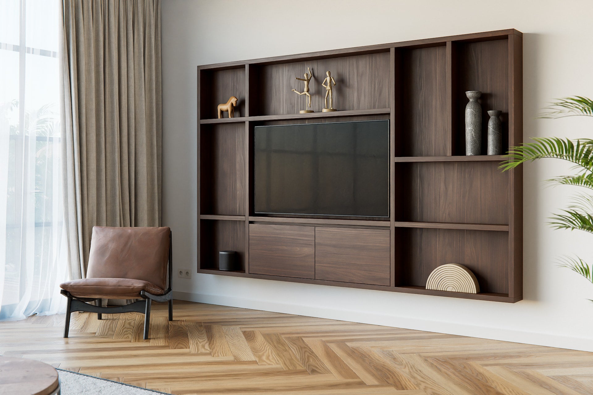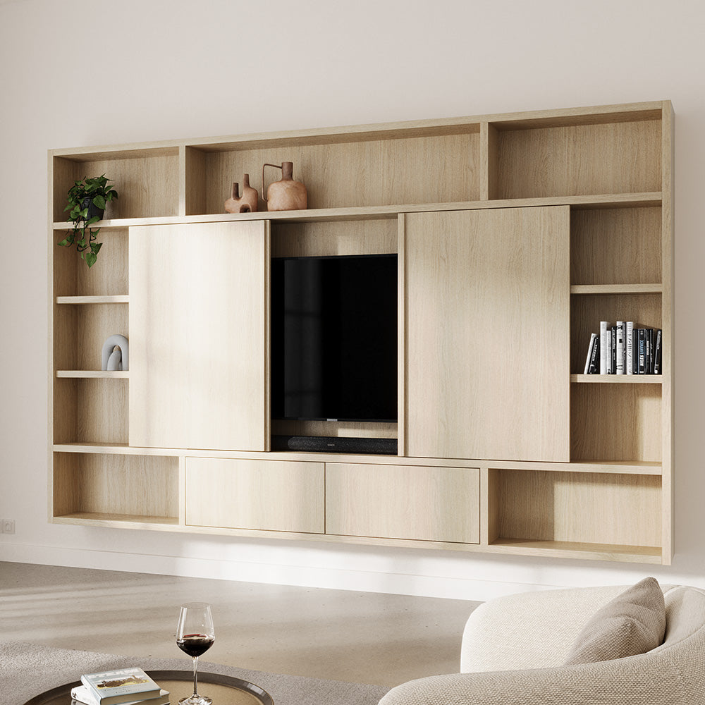 Een ondiepe tv-kast voegt extra ruimte en stijl toe aan je interieur. Het ondiepe meubel biedt volop plek voor een groot tv-scherm en een flexibele vakindeling die je volledig naar eigen wens kunt indelen.
